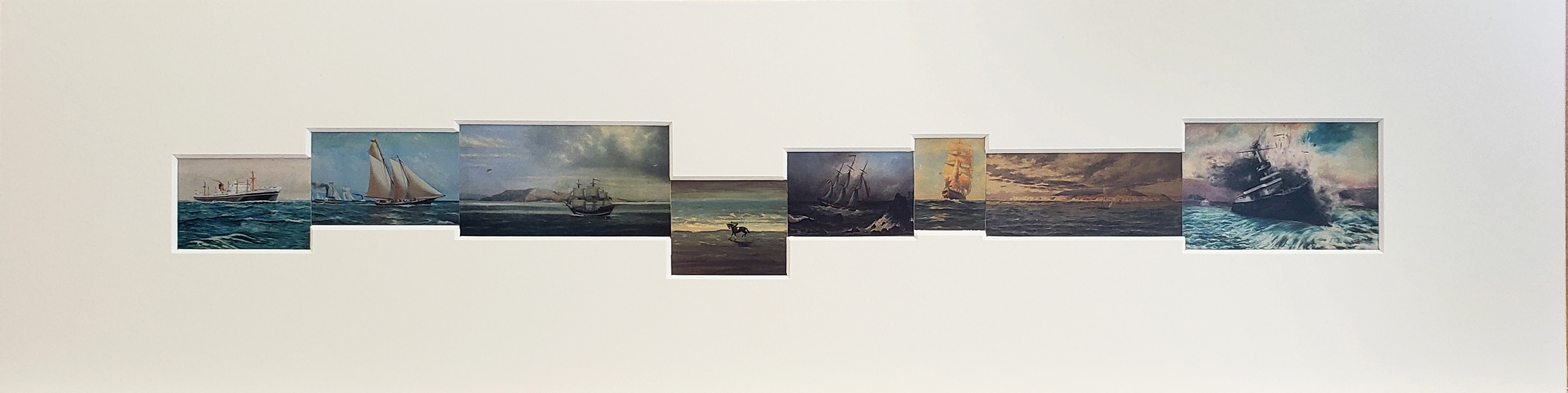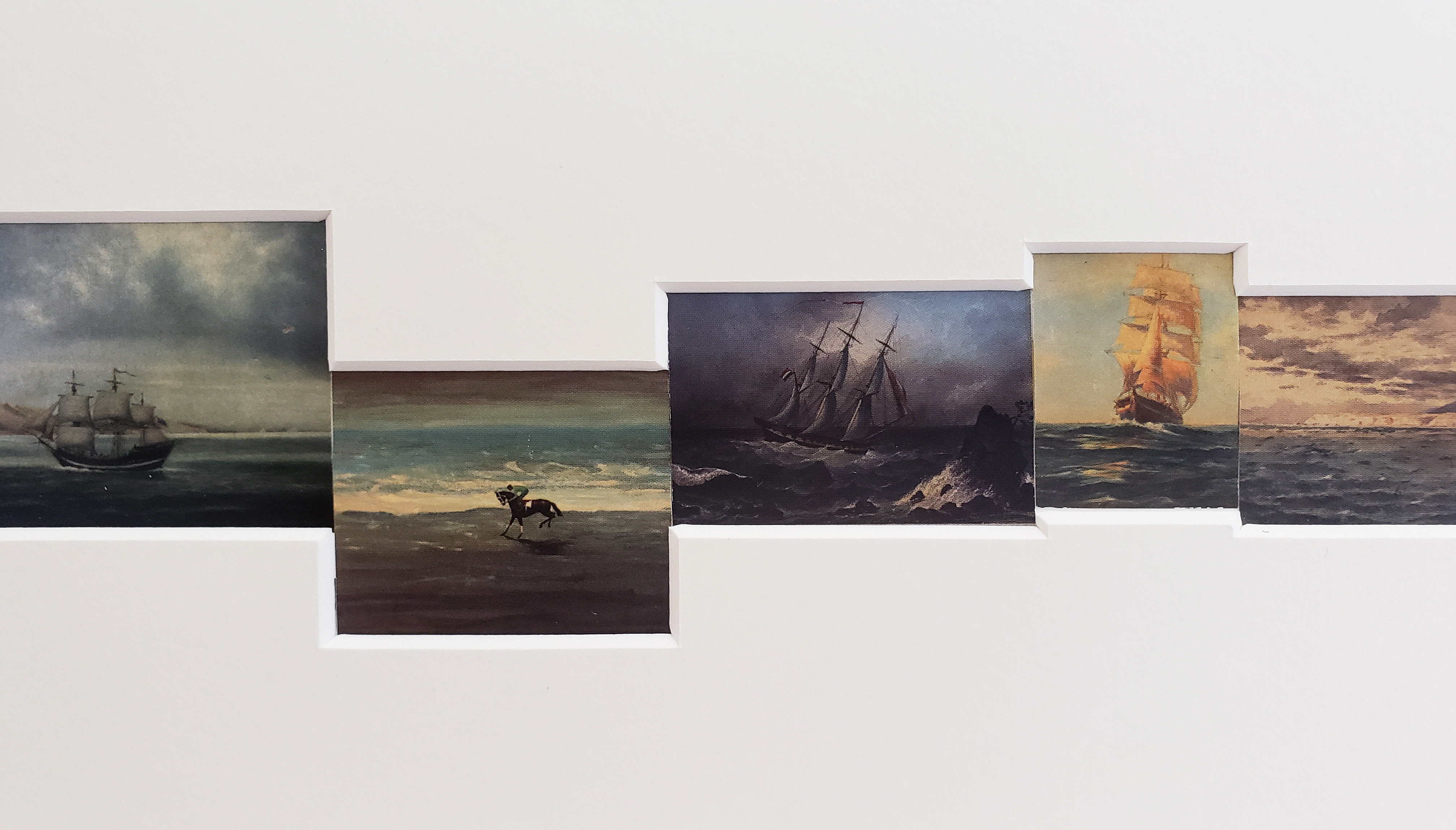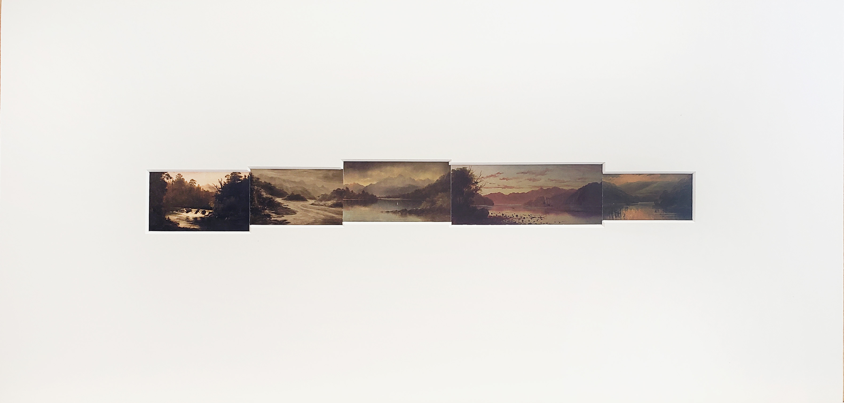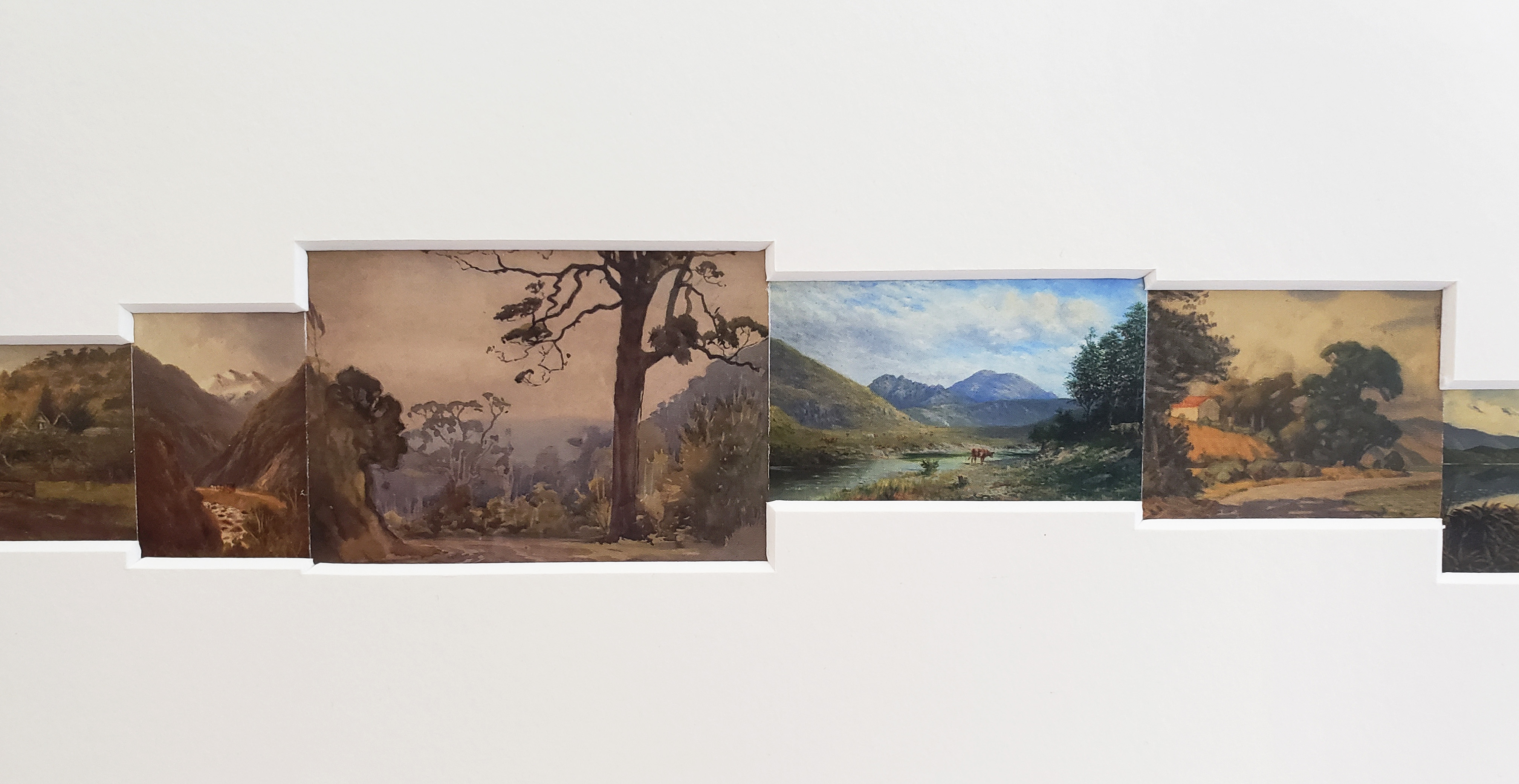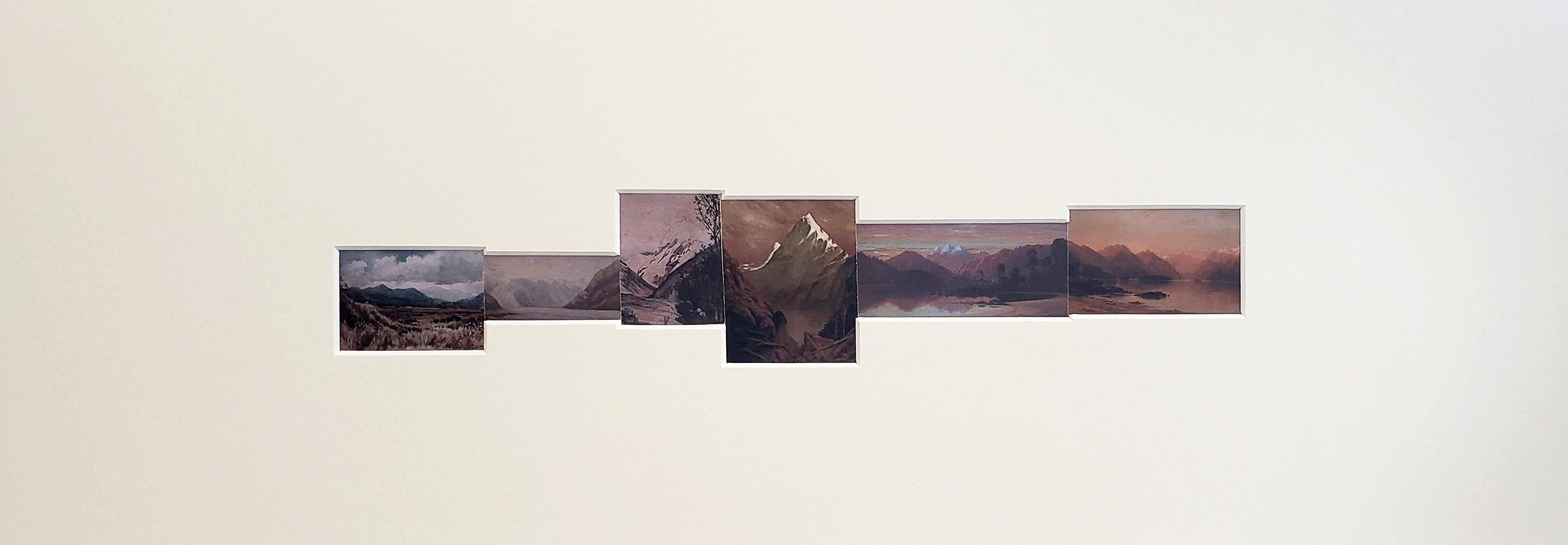 Rose Meyer‘s collages of miniature landscapes in muted colours recombine landscape paintings from art auction catalogues. These collages index the process of landscape being painted, printed, photographed, marketed, printed again, cut up, assembled, photographed again, printed again. Meyer’s images highlight the radical instability of real-estate-as-property. Her hybrid landscape works chart how the land (and then its image) is cut up and commodified, sold and resold again and again. Meyer’s works bundle connection to whenua with a deconstruction of the landscape tradition, bound up as it is in colonisation, ownership and enclosure. They are pointedly collectivised history paintings, amalgams that can outlast reductive individual title and extractive land practices. (full PDF of Catalogue here)