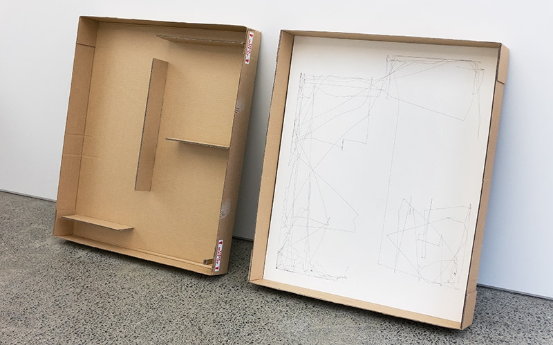 Site specific self drawing box made to the dimensions of Sanderson Gallery and posted from the artist to the gallery.