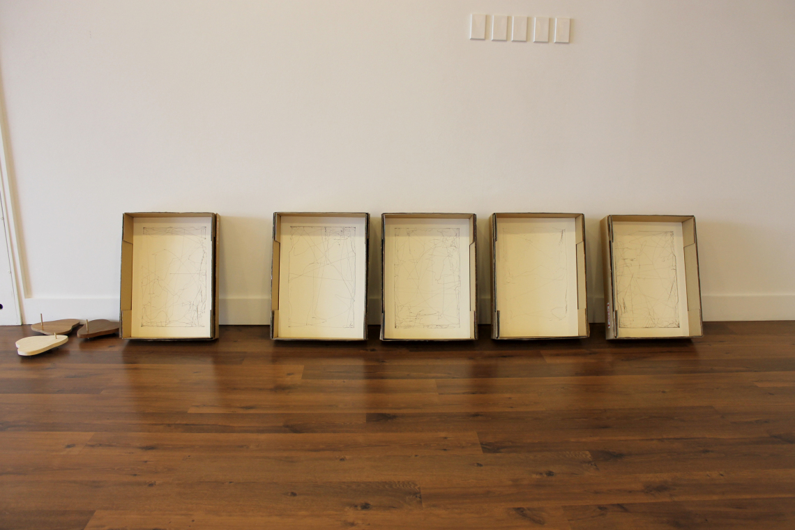 Tracked (series of 5), Ink on mounted paper, 455 x 610 x 150mm Posted from the artist’s studio to the Wallace Gallery Morrinsville.