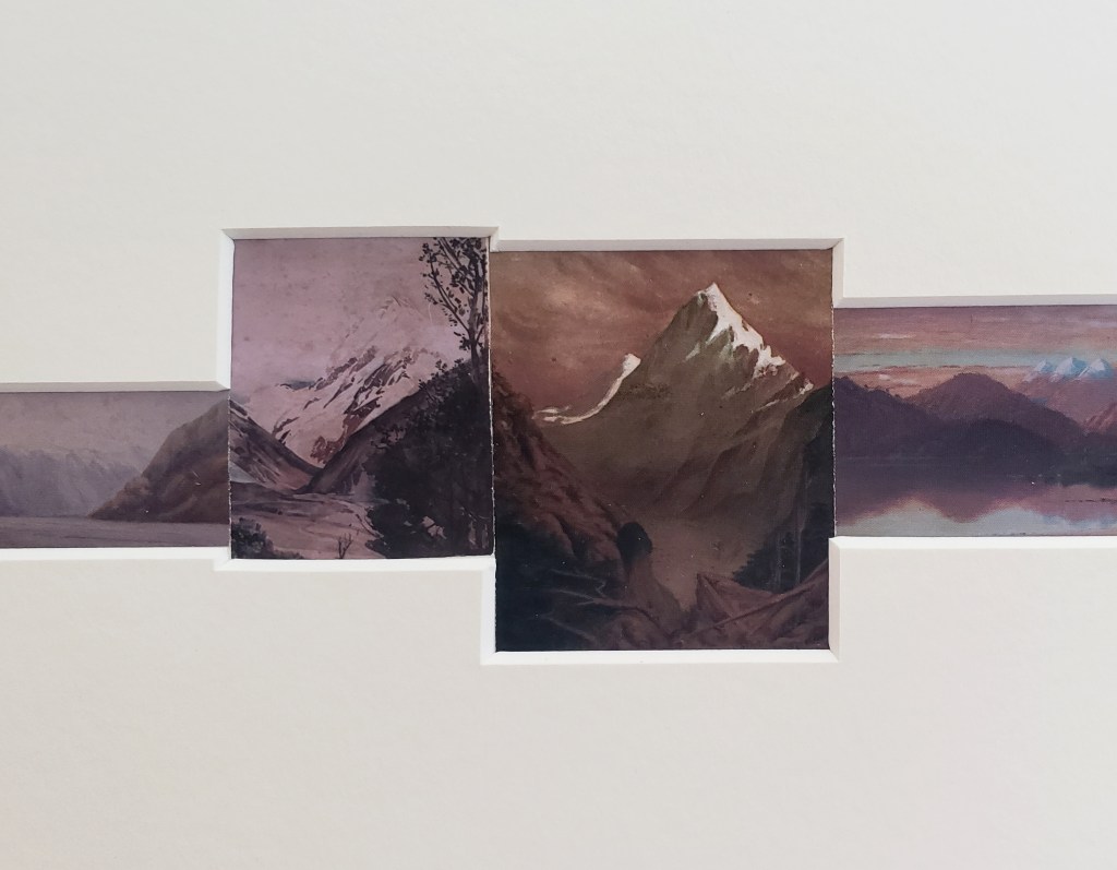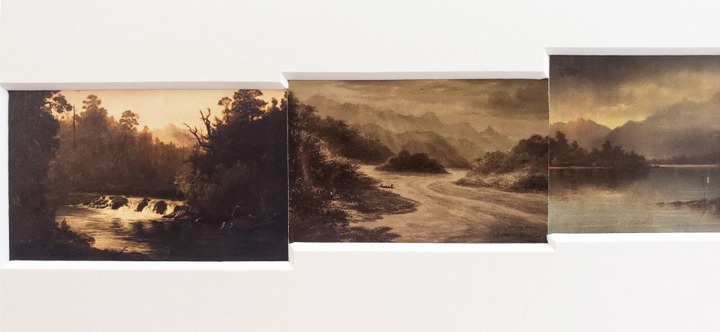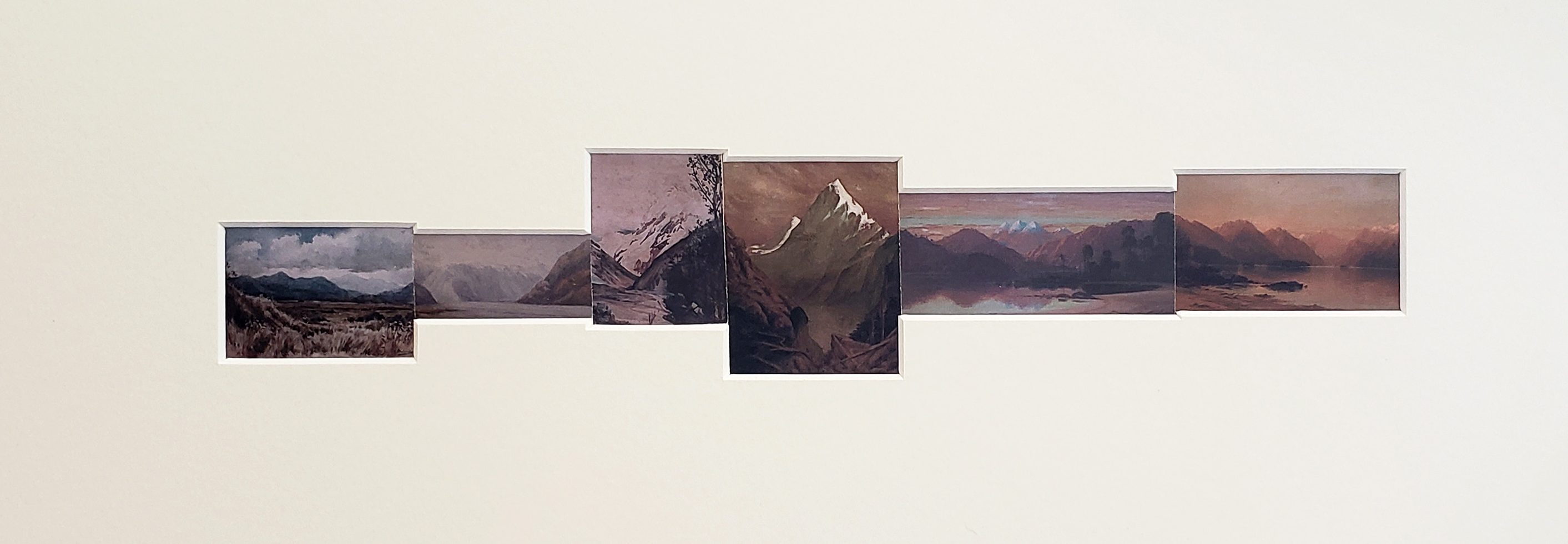 Rose Meyer‘s collages of miniature landscapes in muted colours recombine landscape paintings from art auction catalogues. These collages index the process of landscape being painted, printed, photographed, marketed, printed again, cut up, assembled, photographed again, printed again. Meyer’s images highlight the radical instability of real-estate-as-property. Her hybrid landscape works chart how the land (and then its image) is cut up and commodified, sold and resold again and again. Meyer’s works bundle connection to whenua with a deconstruction of the landscape tradition, bound up as it is in colonisation, ownership and enclosure. They are pointedly collectivised history paintings, amalgams that can outlast reductive individual title and extractive land practices. (full PDF of Catalogue here)